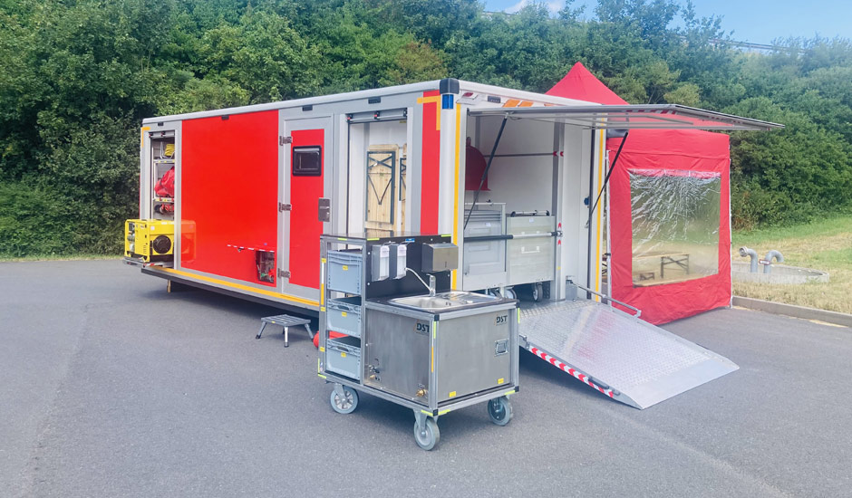 Nachdem bei einem durchgeführten Führungskräfteseminar im vergangen Jahr in Hettenhain unter anderem das Thema "Feuerkrebs" durch einen Dozenten vorgestellt wurde, konnte eine bestehende Lücke bei den Feuerwehren der Stadt Bad Schwalbach in Bezug auf "Dekontamination" an der Einsatzstelle erkannt und ein Handlungsbedarf festgestellt werden. In diesem Arbeitsfeld der gesundheitlichen Prävention ist Arbeitsschutz Aufgabe des Unternehmers und dieser muss im Rahmen der ermittelten Gefährdung dafür Sorge tragen, dass eine eventuelle Kontaminationsverschleppung bis auf ein Minimum reduziert besser ausgeschlossen und das benötigte Gerät bereitgestellt wird. Wie bei vielen Feuerwehren stellte sich auch hier die Frage was passiert mit Kameradinnen und Kameraden direkt nach dem Einsatzgeschehen welche sich umziehen müssen um diesen einen bestmöglichen Schutz zu bieten. Im Frühjahr wurde deshalb durch die zuständigen Stellen im Rathaus das "GO" gegeben sich der Beschaffung eines Abrollcontainers Hygiene oder auch im Feuerwehrfachchagon "Schwarz-Weiss" anzunehmen. In einer kleinen Arbeitsgruppe wurde der Markt sondiert und eine Ausschreibung erstellt. Den Zuschlag für den Auftrag erhielt die Firma DST Innovation aus Buchen, welche sich speziell mit der Dekontamination, vor allem im Militärbereich, als Schwerpunktgebiet befasst. Der neue Abrollcontainer wurden vor rund 2 Wochen im Werk abgeholt und eine kleine Mannschaft erhielt eine Einweisung in die Neue Technik.